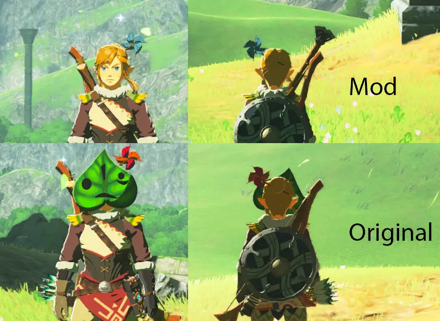 You can see some additional comparison photos at the Original pull request -- I love using the Korok mask because I like the hints for the seeds, but I always disliked how the mask looked and didn't want to wear it all the time because of that. This removes the mask but keeps the hairstyle and the windspinner which still spins when seeds are nearby. https://www.nexusmods.com/legendofzeldabreathofthewild/mods/76?tab=description -- Both of these work well on the steam deck as well! |